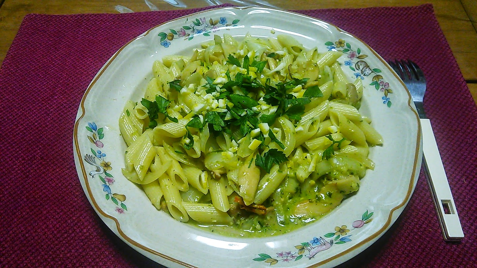 今日は一人のランチ。ペンネをバジルソースで作ってみました。風味づけでイタリアンパセリとレモンのみじん切りをトッピングします。
